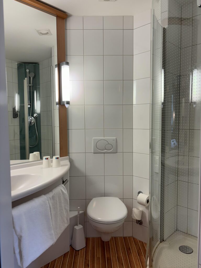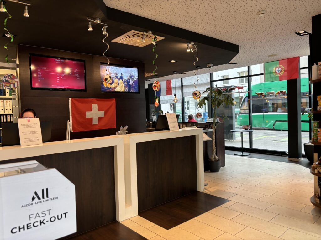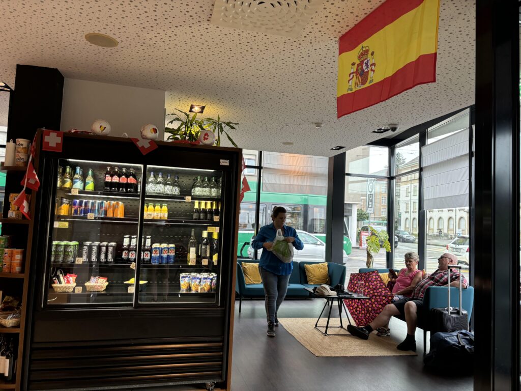 チェックインするのにこの旅で初めて待ちました。お客さんがひっきりなしにやってきますが、基本てきぱき処理されています。湯沸かしポットもフロントで言えば貸出し可。その際、デポジットを求められます。携帯の充電などは機能的で楽でした。ビジネス仕様とはいえ、観光地でもこうあって欲しいですね。また、友人と合流する翌日の友人のスーツケースも預かり可とも言ってもらいました。(結局、雨模様のため予定を変更したので預けませんでしたが💦)夜、周りのお店が閉まる中、バーゼル駅構内のCoop prontoが夜遅くまで開いていたので翌日の朝食難民にならずにすみました。また、トラムの停留所が近く重宝しました。日本の都市部のホテルと大差ありません。